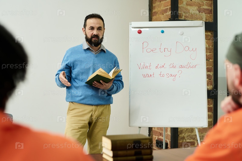 Мужчина средних лет преподает уроки поэзии взрослым заключенным