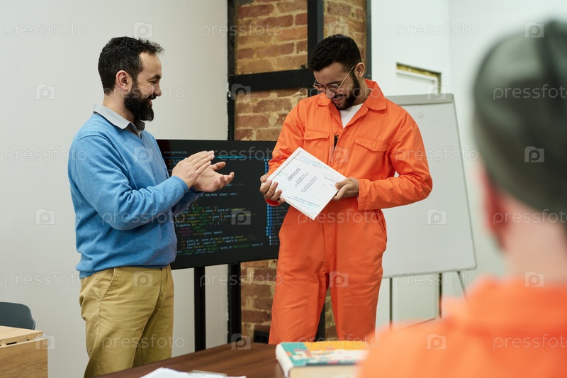 Мужчина среднего возраста аплодирует молодому взрослому мужчине, который получает сертификат
