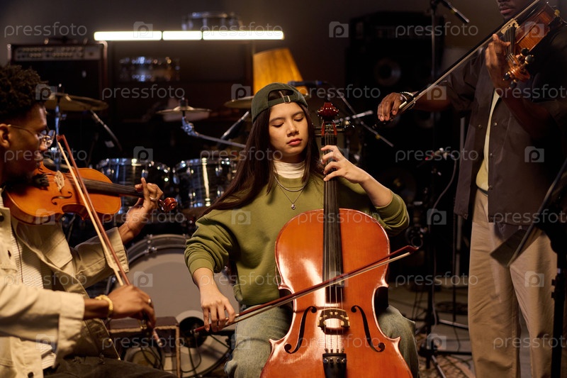 Молодая латиноамериканка играет на виолончели с различными музыкантами, выступающими в студии