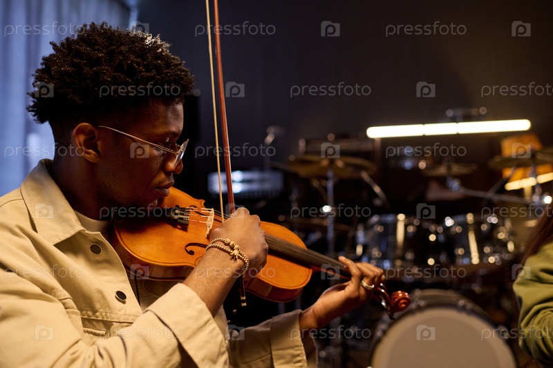 Молодой чернокожий мужчина играет на скрипке в музыкальной студии во время репетиции