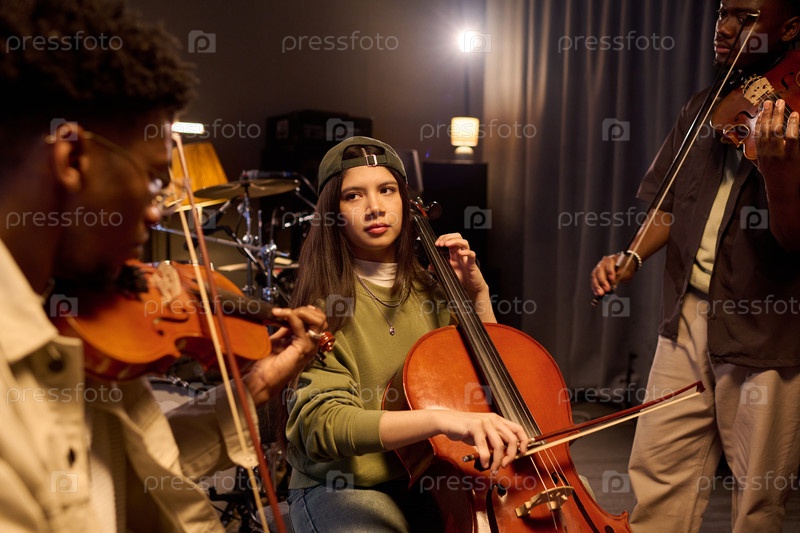 Латинская девушка играет на виолончели с многонациональными музыкантами, выступающими