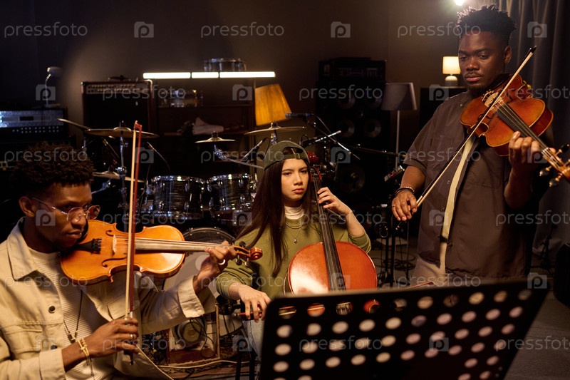 Музыканты-многонациональные молодые взрослые репетируют классическую музыку в студии