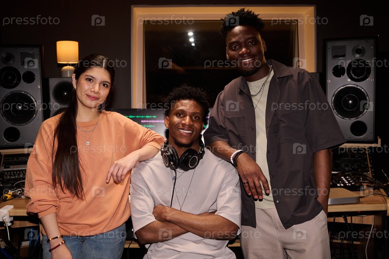 Мультиэтнические молодые взрослые сотрудничают в музыкальной студии звукозаписи Улыбаясь