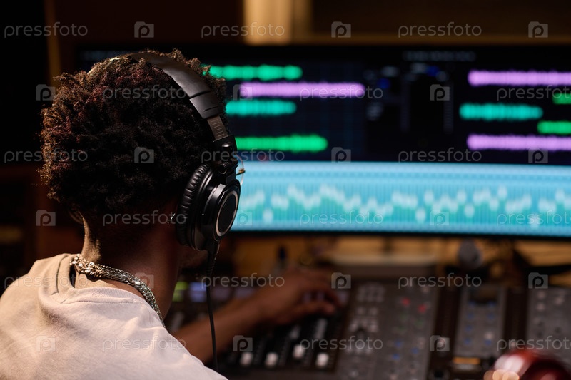 Чернокожий молодой человек микширует аудио треки в профессиональной музыкальной студии