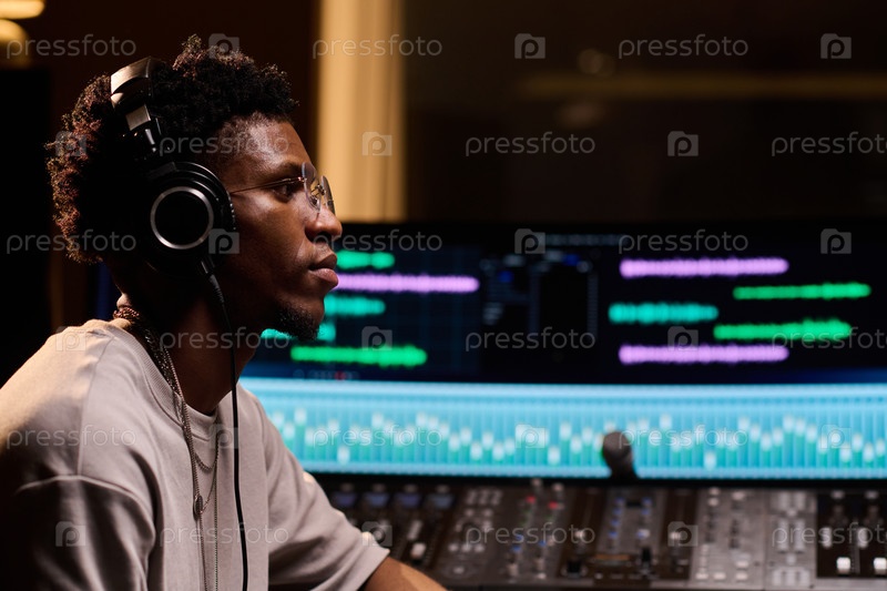 Молодой взрослый чернокожий мужчина, носящий наушники, работает в музыкальной студии