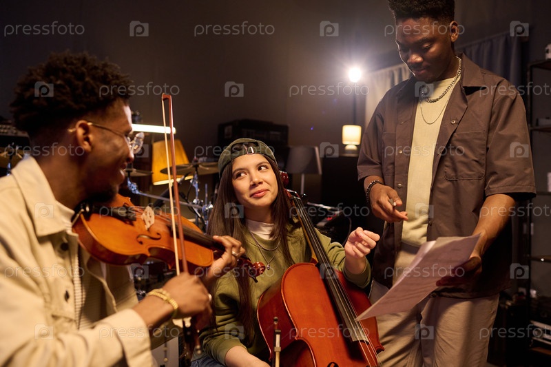 Мультиэтнические молодые взрослые репетируют музыку вместе в студии записи