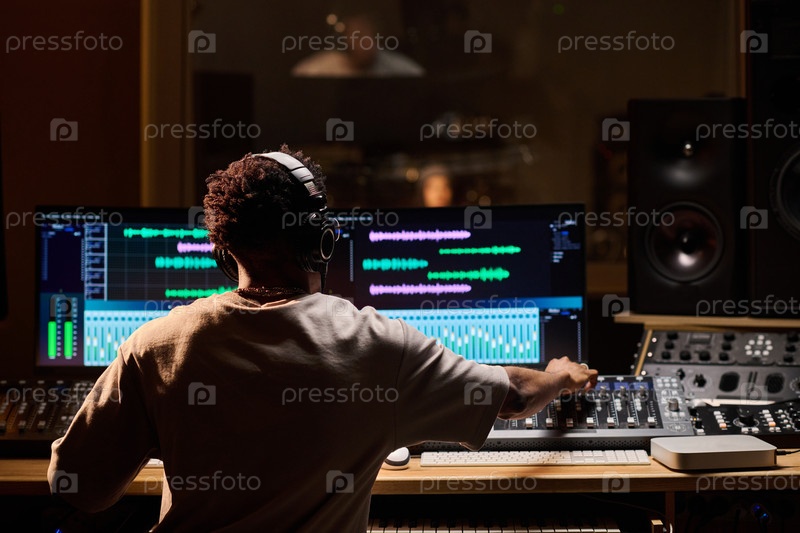 Молодой взрослый чернокожий мужчина, носящий наушники, настраивает аудиомиксер в студии
