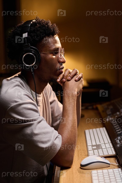 Молодой чернокожий мужчина с наушниками внимательно слушает в студии записи
