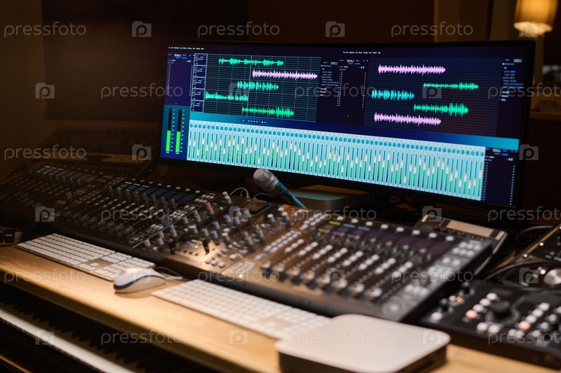 Аудиоинженер, смешивающий треки на профессиональном оборудовании звуковой панели студии