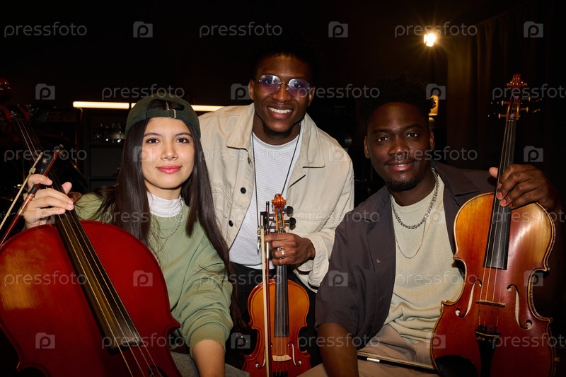 Мультиэтнические молодые взрослые улыбаются, держа струнные инструменты в студии