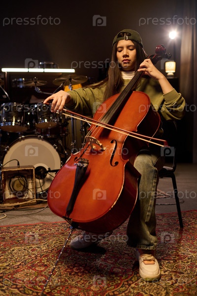Молодая взрослая испаноязычная женщина играет на виолончели в музыкальной студии во время репетиции
