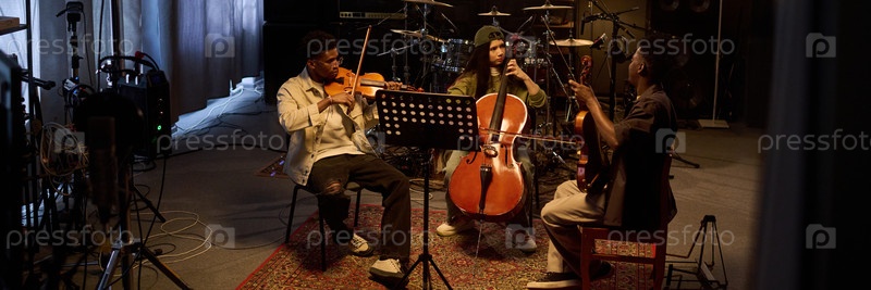 Мультиэтнические музыканты играют на струнных инструментах во время музыкальных репетиций