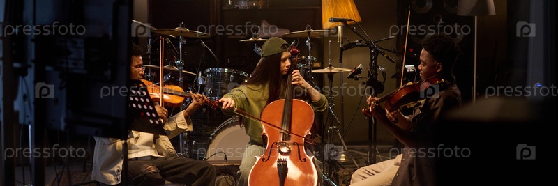 Мультиэтнические музыканты исполняют струнный ансамбль в студии записи