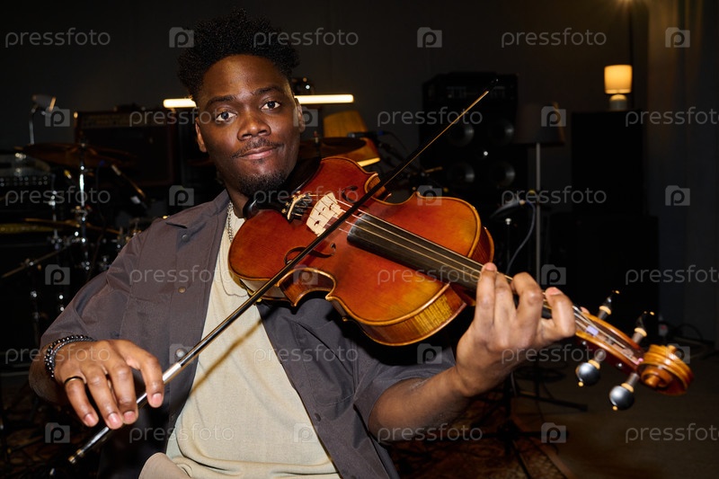 Портрет молодого взрослого чёрного мужчины, улыбающегося во время игры на скрипке в студии