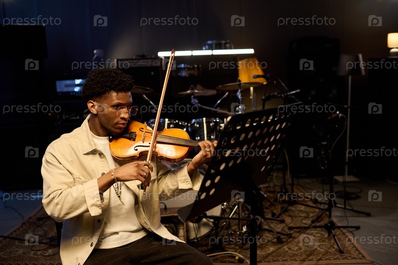 Молодой взрослый чернокожий мужчина практикует скрипку за музыкой на стенде в студии