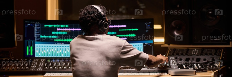 Молодой взрослый чернокожий мужчина, носящий наушники, создает музыку на аудио-рабочей станции