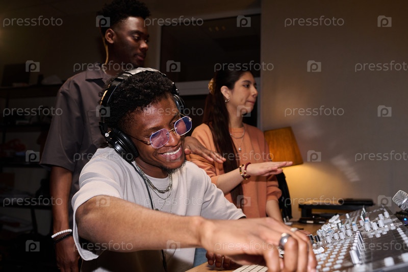 Молодой чернокожий мужчина смешивает музыку с различными молодыми взрослыми в студии записи