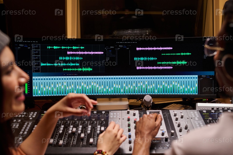Молодые взрослые мультиэтнические музыканты смешивают аудиотреки в профессиональной студии