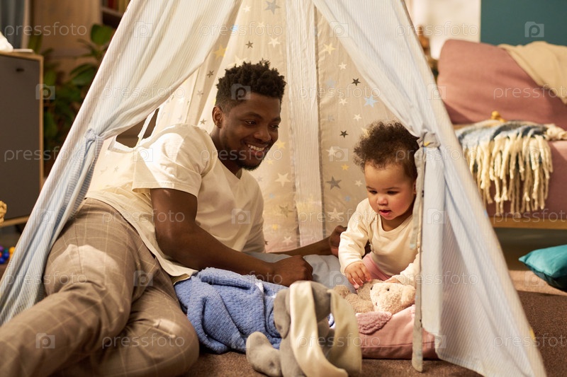 Молодой чернокожий отец играет с младенческой дочерью внутри крытой игровой палатки дома