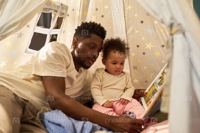 Молодой чернокожий отец занимается с дочерью, читая иллюстрированную книгу