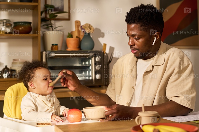 Молодой чернокожий отец кормит ребенка, проводя время вместе во время отпуска по уходу за ребенком