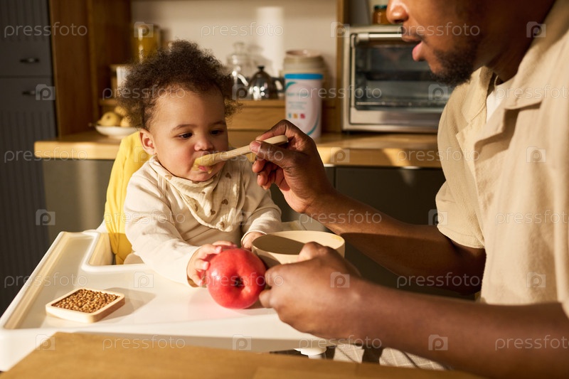 Молодой чернокожий отец кормит младенца во время отпуска по уходу за ребенком