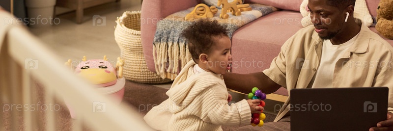 Молодой взрослый чернокожий мужчина заботится о ребенке, работая удаленно во время отпуска по уходу за матерью