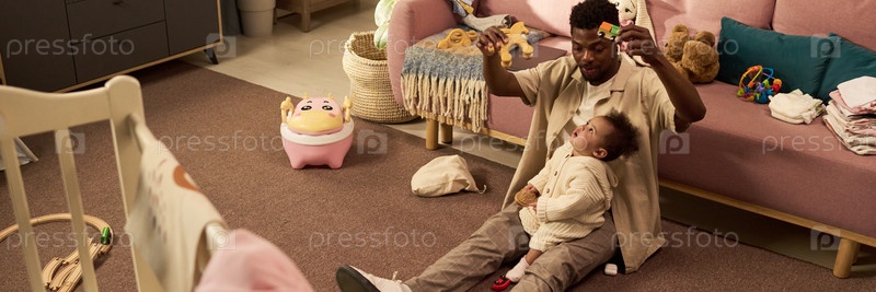 Юный чернокожий отец развлекает ребенка во время отцовского отпуска дома