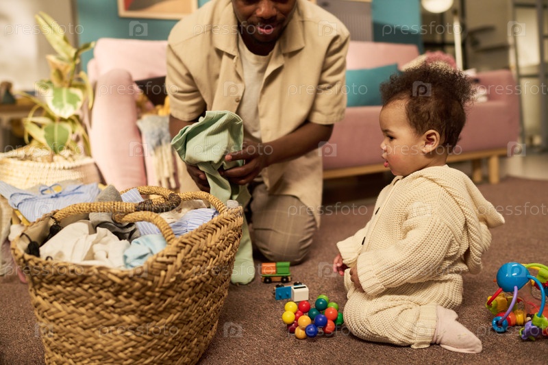 Молодой взрослый чернокожий мужчина заботится о ребенке во время отпуска по отцовству дома