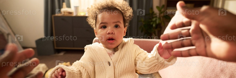 Девочка младенческого происхождения достигает вытянутых взрослых рук в помещении