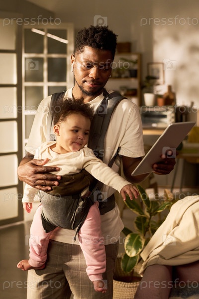 Молодой чернокожий мужчина держит свою дочь в руках, используя цифровой планшет дома
