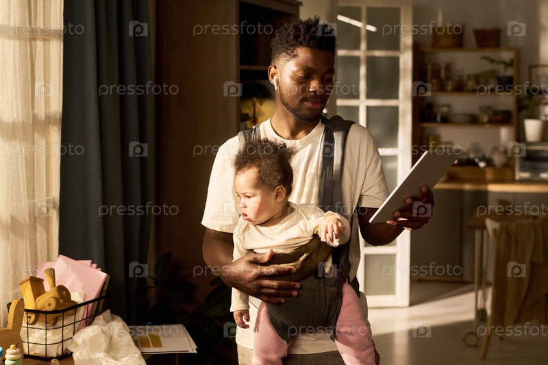 Молодой чернокожий отец держит ребенка, используя цифровой планшет во время отпуска по уходу за ребенком