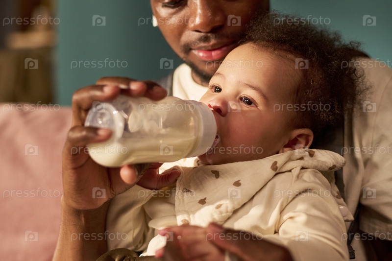 Молодой чернокожий отец кормит младенца бутылкой во время отпуска по уходу за ребенком