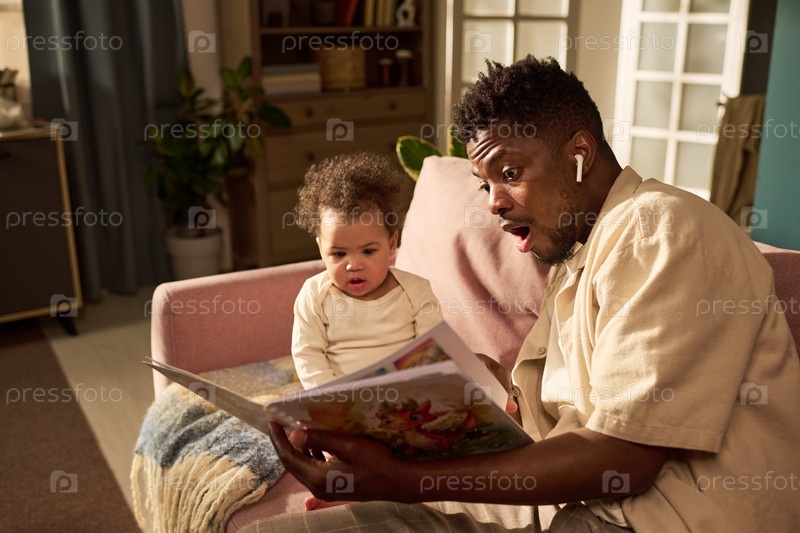Молодой чернокожий отец читает сказки ребенку во время отпуска по уходу за матерью дома