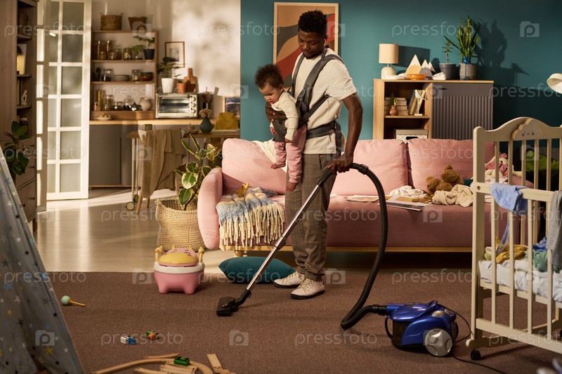 Молодой чернокожий отец заботится о ребенке, пылесося в гостиной во время отпуска по уходу за матерью