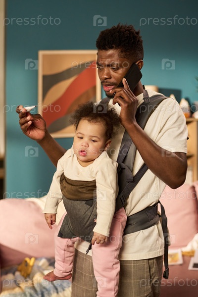 Молодой чернокожий отец держит ребенка, разговаривая по телефону во время отпуска по уходу за ребенком