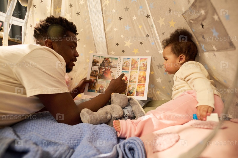 Юный чернокожий отец вовлекает младенческую дочь с книгой рассказов внутри игровой палатки