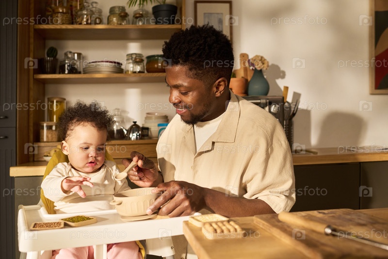 Молодой чернокожий отец кормит свою дочь, проводя отпуск по уходу за ребенком дома