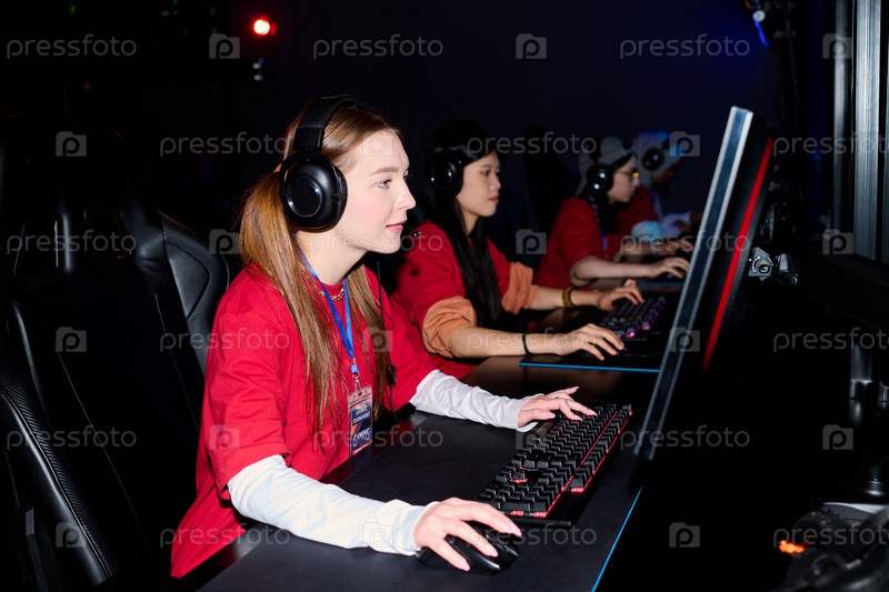 Команда многонациональных девочек-подростков играет в видеоигры на компьютерах в Esports Arena