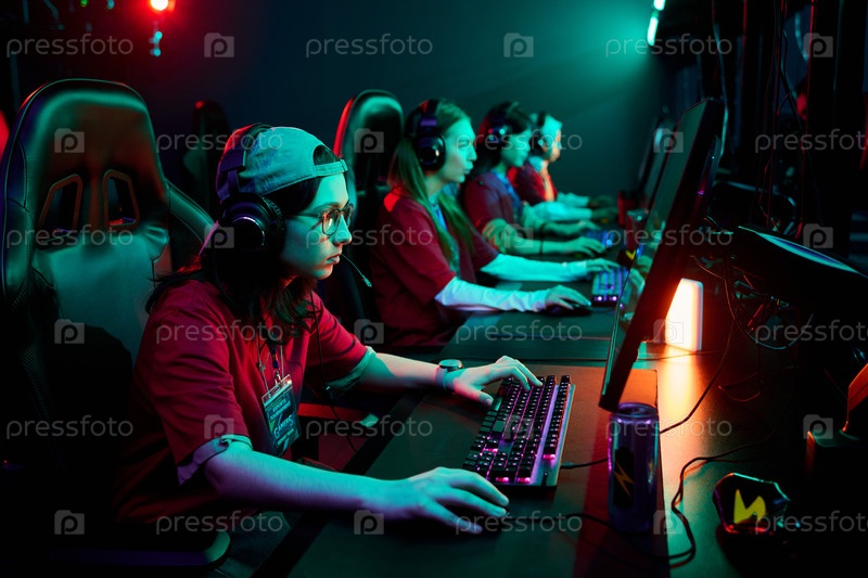 Команда подростковых девочек-эспортеров соревнуются в онлайн многопользовательском видеоигровом турнире