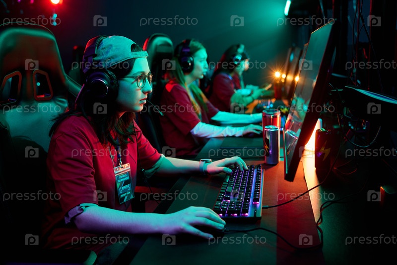 Команда многонациональных девочек-подростков играет в видеоигры вместе на спортивной арене