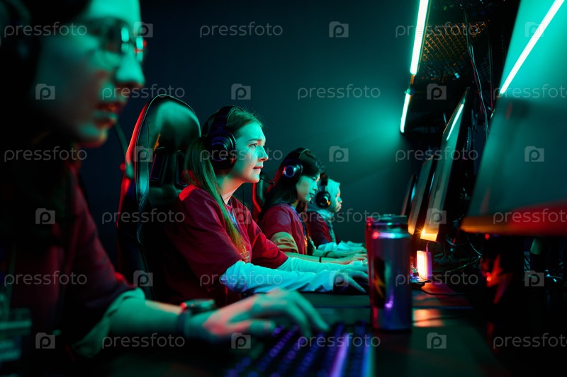 Команды девочек-подростков играют в видеоигры вместе на Esports Arena