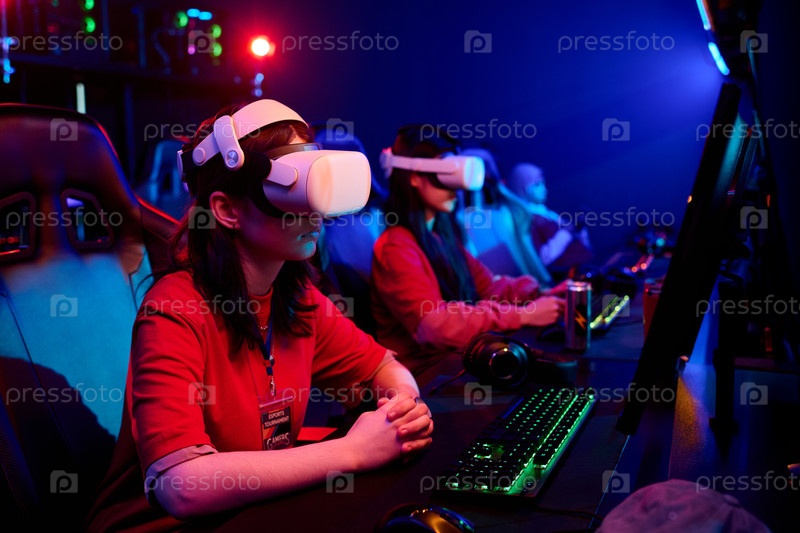 Азиатские девочки-подростки, участвующие в турнире по киберспорту с использованием гарнитур виртуальной реальности