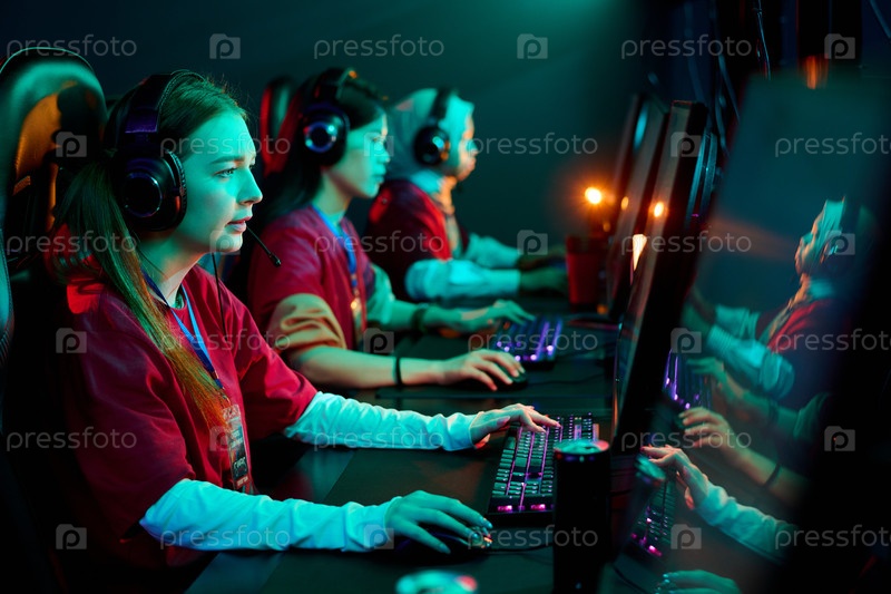 Команда игроков-подростковых девочек, участвующих в турнире по киберспорту с использованием компьютеров