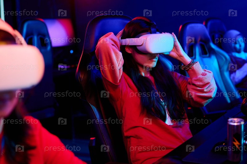 Команда девочек-подростков, испытывающих игры виртуальной реальности в Esports Arena