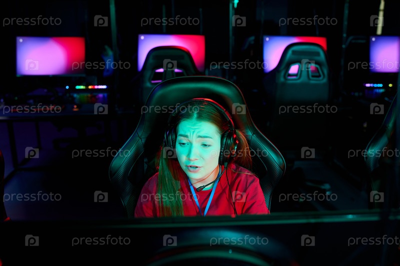Подростковая девушка-геймер внимательно сосредотачивается во время потоковой трансляции конкурса на электронные виды спорта