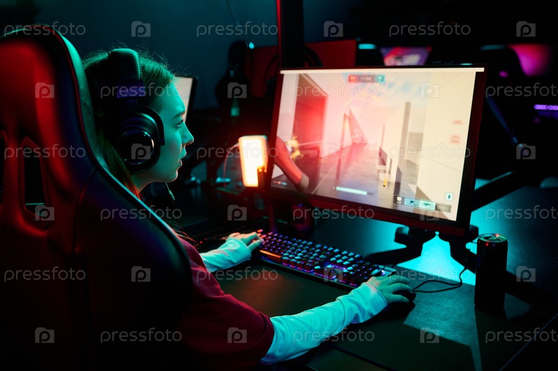 Подростковая девушка-геймер играет в многопользовательскую видеоигру на компьютере