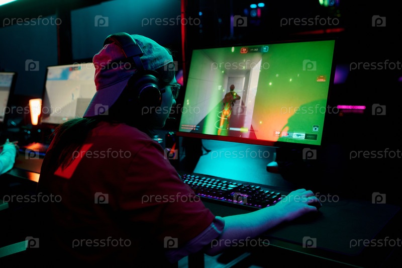 Подростковая девушка-геймер, активно соревнующаяся в командном матче по киберспорту