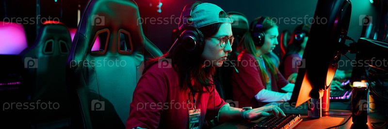 Команда подростковых девушек-игроков, конкурирующих интенсивно в среде Esports Arena