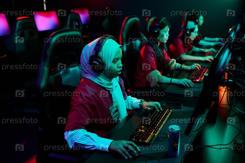 Разнообразная команда девочек-подростков играет в электронные видеоигры на игровых компьютерах